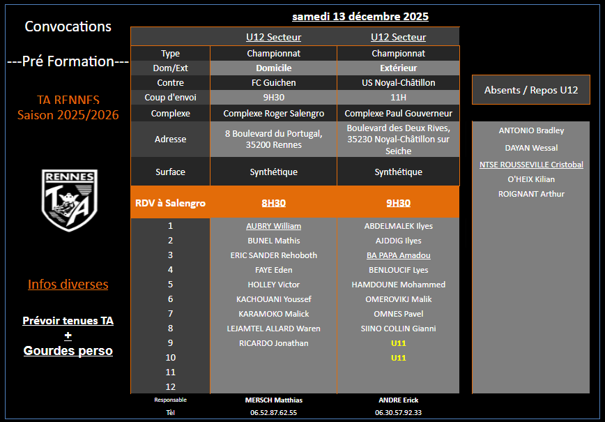 Responsable pôle Pré-formation U12-U13 : Paul Yvoir Référent U12 : Matthias Mersch 06.52.87.62.55 Référent U13 : Paul Yvoir 06.31.89.84.65